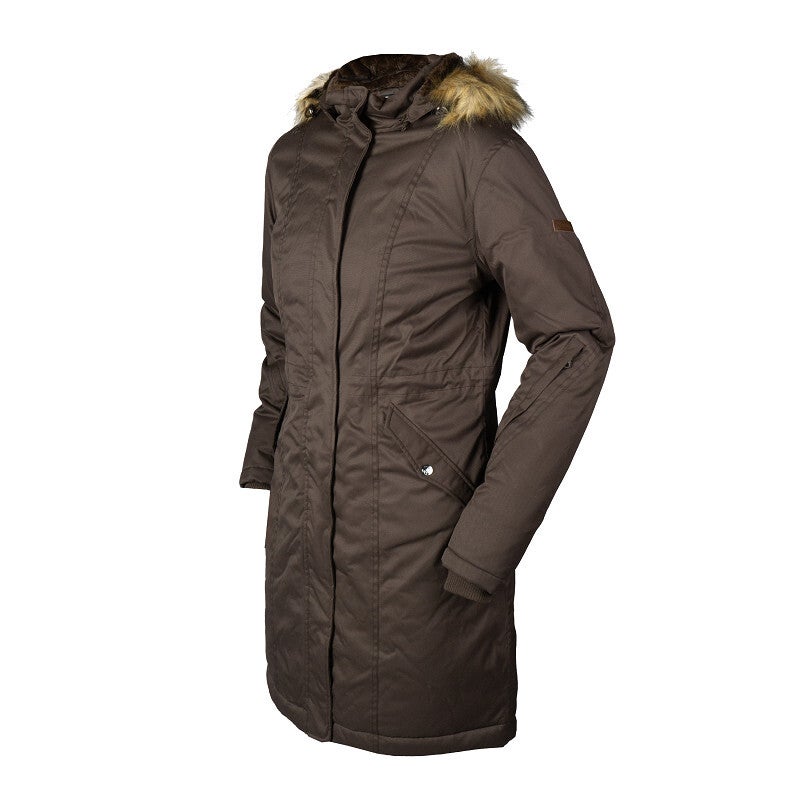 Modieuze outdoor jas van waterdicht materiaal met getapete naden en windflappen aan de binnen- en buitenkant van de rits, wat deze jas perfect maakt voor verschillende weersomstandigheden. De jas heeft een afneembare capuchon met een imitatie bontrand. De jas is voorzien van een fleece gevoerde opstaande kraag voor extra warmte. De jas beschikt over vele handige details; voorzakken, binnenzakken, verborgen borstzakken en een split aan de achterkant, wat deze jas ook geschikt maakt voor het paardrijden.